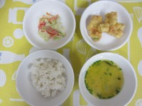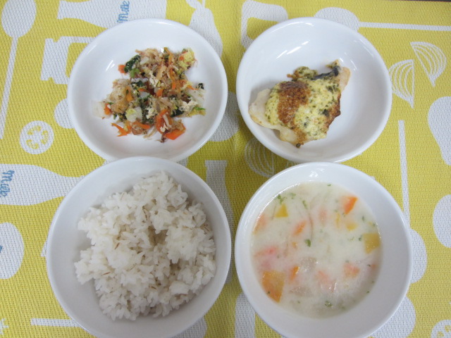 ●ごはん●魚のマヨネーズ焼き●こぎつねサラダ●ベーコンチャウダー