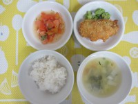 ●ごはん●魚のチーズフライ●トマトの甘酢漬け●白菜のみそ汁