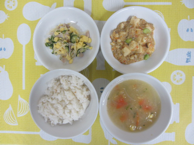 ●ごはん●マーボーとうふ●ハムともやしの中華和え●コーンスープ