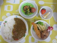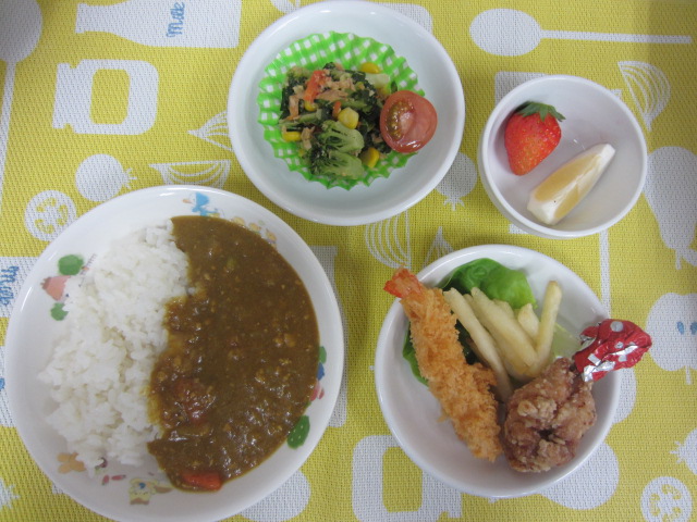 ●カレーライス●フライドチキン●エビフライ●こーんとわかめのサラダ●果物
