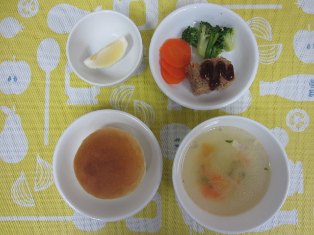 ●パン●ハンバーグ●温野菜●オニオンスープ●果物