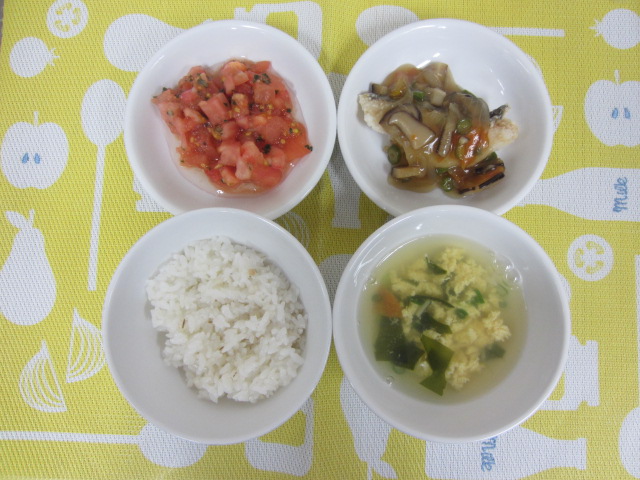 ●ごはん●魚の野菜あんかけ●トマトの甘酢漬け●かきたま汁
