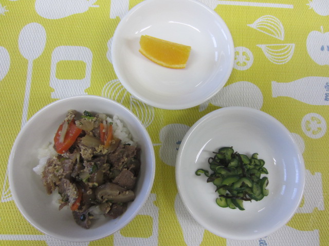 ●ごはん●牛肉の柳川風●きゅうりの昆布和え●果物